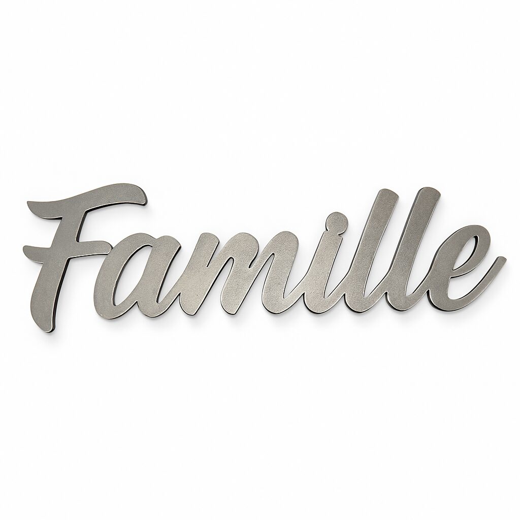 Le mot ”Famille” en acier, une pièce décorative solide et élégante qui apporte chaleur et caractère votre espace. Rustique, Industriel ou Moderne, il s’intègre aussi bien dans la maison que dans un espace de professionnel.